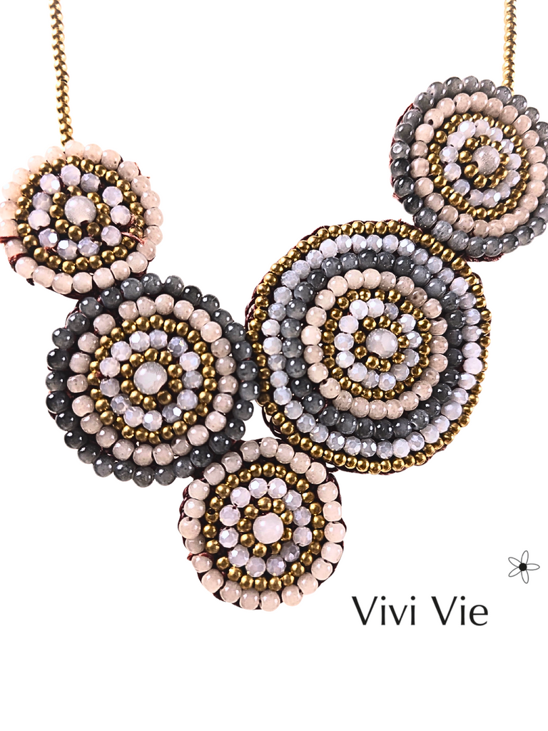 ELevate any outfit with this efforless elegant necklace with a bohemian flare. Hand made with love intricate detailed beading with stones in neutral shade of taupe, a soft off ceam, framed with gold brass beads, making it perfect to accessorise with gold earings, rings or braclets, with the neutral colours its a piece you can easily wear from Summer to Winter. In the winter over a sweaters to add some detail, then to evening over an open neck dress or top to elevate Aprefect gift for a jewellery lover.