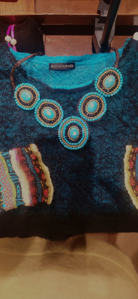 Immerse yourself in a turquoise Vivi vie staement necklace. Each pendant is hand seven on a banking of a waxed linnen weave for comfortable while wearing. The center turquoise blue stones is is framed by a intricatbeading, layer of brass beads , then set against a layer of black faceted then blue following with a layer of bras, creating a striking contrast and making a really great statment that effortlessly draws the eye.This is more than just an accessorie designed to elevate any ensemble with it's unique blend of a bohemian charm and refind sofistication.