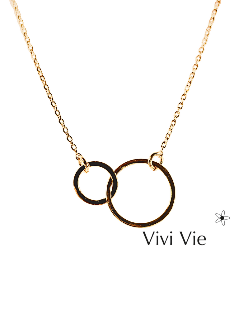 Minimalist intelocking gold double circle necklace.The two inerlocking circles