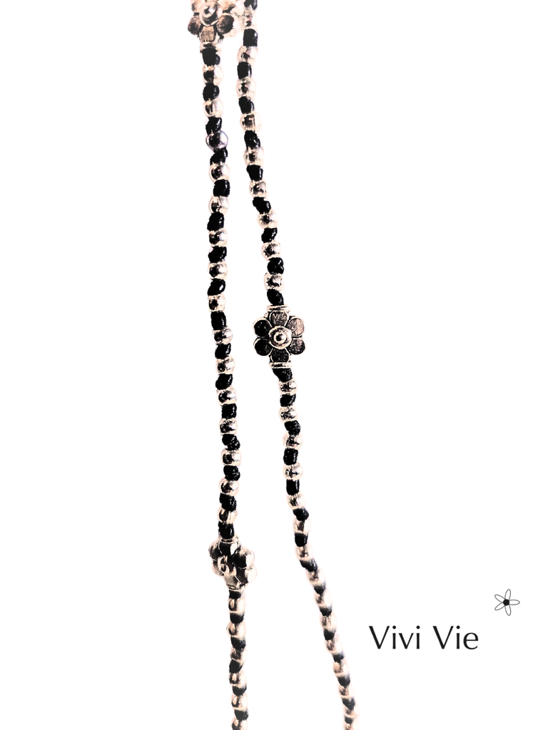 A must for the jewellery lover this 80cm long necklace is hand knotted with silver beads and scattered with some small silver flowers for some extra detail. A verry strong and durable pice that will last. Wear long or short lots of room for adjusting. A great gift idea.