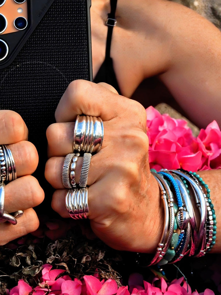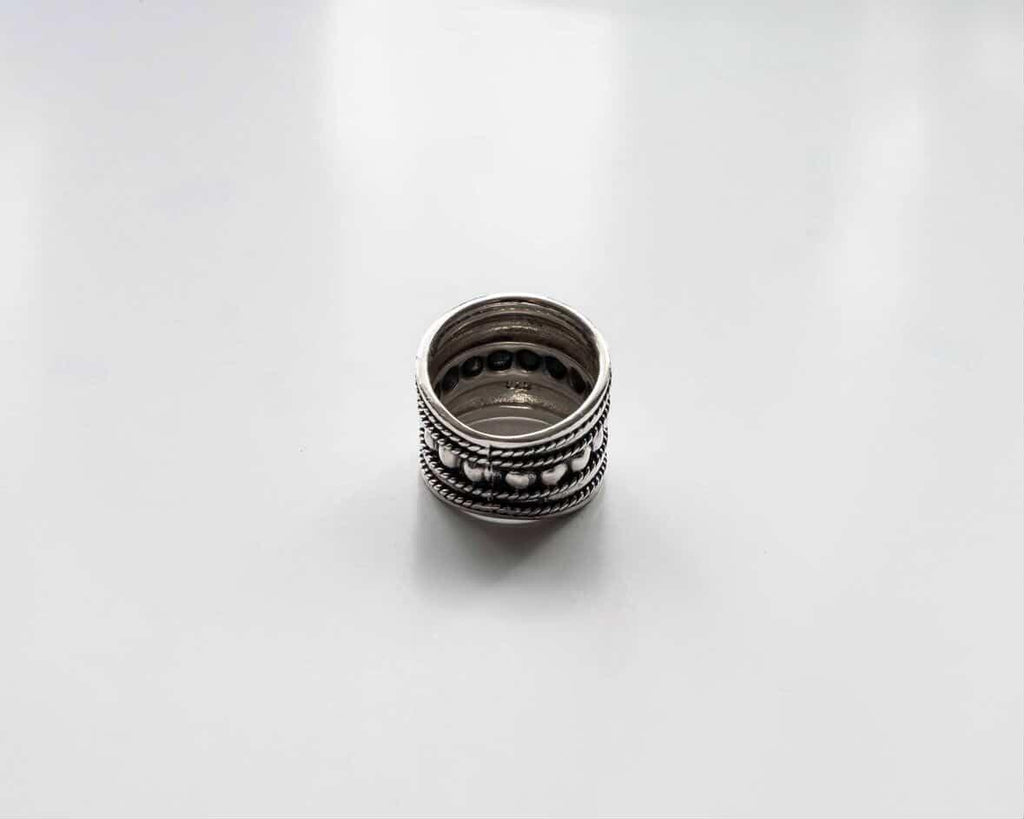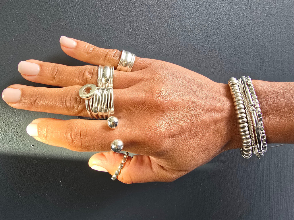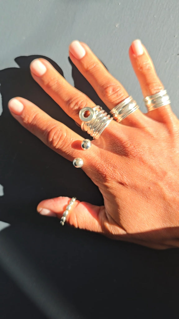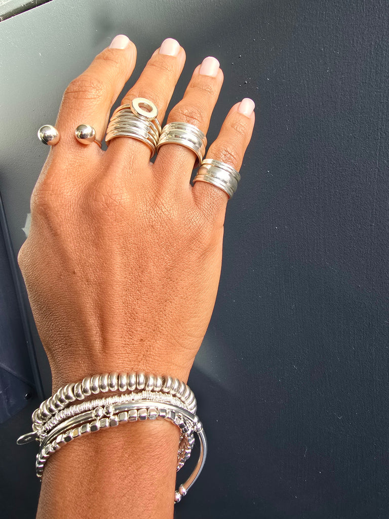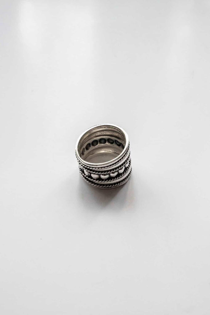 The perfect harmony of texture and and shine with the silver rythem design ring. The layered essentials that brings an efforless, stacked aesthetic to your everyday style. Its a one- and-done ring!A statment piece for every jewellery lover.